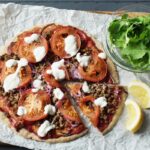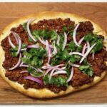 Tomato base, garlic, black pepper, lamb with spices, mozzarella, sliced onions, and baby